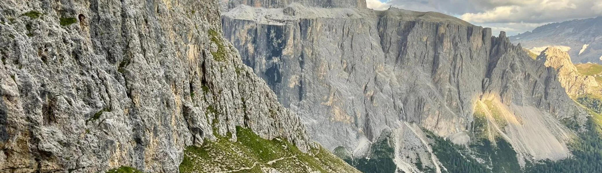 Am Dienstag starteten wir zur Kleinen Micheluzzi am Piz Ciavazes, circa 30 Autominuten vom Camping Colfosco entfernt. Am Parkplatz angekommen, schauten wir der 400 Meter hohen ausgesetzten Wand empor und wussten, dass die Kleine Michelouzzi mit ihren zehn Seillängen herausfordernder werden würde, als die bisherigen. Nach einem 15minütigen Fußmarsch erreichten wir den Einstieg. Die erste Hälfte der Route gestaltete sich beinahe gemütlich, während sich Klettern über Schrofengelände mit längeren Wartepausen stets abwechselten. Nach gut der Hälfte der Route begann eine steile Wandkletterei (IV bis V-) mit ausgesetzten Passagen in 250 Metern Höhe. Die „alten Hasen“ zeigten Respekt. Charlotte, die bis dato ihre meiste Zeit lediglich in sterilen Boulder- und Kletterhallen verbracht hatte, boten sich hingegen genügend Gelegenheiten an der exponierten Wand, die „Nähmaschine“ in ihren Beinen zu bestaunen. Um 18 Uhr kamen dennoch alle drei Seilschaften nacheinander wohlbehalten oben an. Trotz später Stunde erblickten wir sofort die nächste Herausforderung: voller Ironie belächelten wir den Umstand, dass wir uns beim Aufstieg auf ein Seil verlassen konnten, den Abstieg aber nun weitestgehend ohne Sicherung bewältigen würden müssen. Auf 400 m Höhe folgten wir zunächst einer grün bewachsenen Querung entlang der Südwand des Piz Ciavazes. Links von uns steil abfallendes Gelände, unter welchem die senkrechte Wand thronte, welche wir kurz zuvor erklommen hatten. Auf dem schmalen Weg war daher höchste Trittsicherheit gefragt. Das bunte Gemurmel der Gruppe verstummte. Dennoch konnten wir uns dem fantastischen Panoramablick nicht entziehen, als sich das warme, orangene Licht der tiefstehenden Abendsonne auf die zahlreichen Gipfel und Felsformationen der Dolomiten legte. Nach insgesamt 60 Gehminuten, gestückt mit steilen Schuttwegen, ungesicherten Klettereien und kurzen Abseilpassagen erreichten wir glücklich und erschöpft den Parkplatz und beendeten den Tag wenig später mit einem gemeinsamen Pizzaessen in Colfosco.
